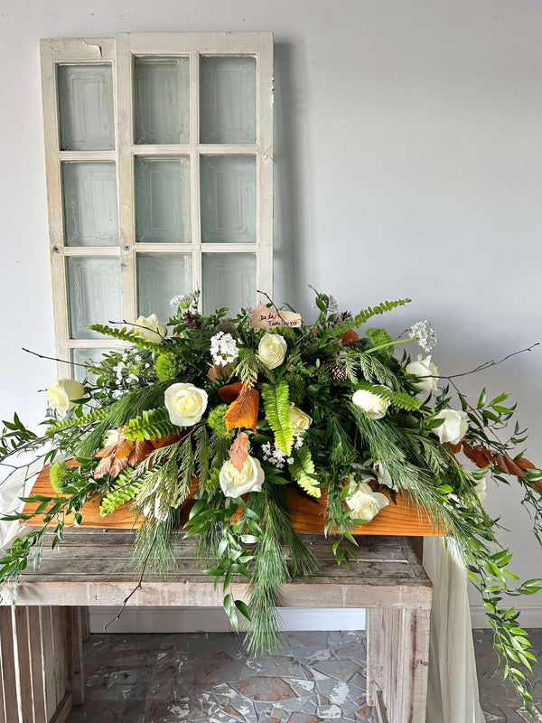 Toutes les compositions de cette collection, qu'il s'agisse de présentoir d'urne, de coussins de cercueil ou de bouquets sont faits avec des fleurs au choix du fleuriste selon la saison et la disponibilité des fleurs.